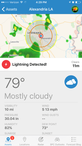Any time an alert (Lightning Proximity, National Weather Service, or WeatherOps Forecaster) is issued for either your current, saved or company’s locations you’ve added, you will receive a push notification. The asset will also show a notification when it is under an alert, as shown here for the PIT asset. If you would like more information on the alert, tap on that asset’s label. You can then select the active alert to get more information, including the full text.